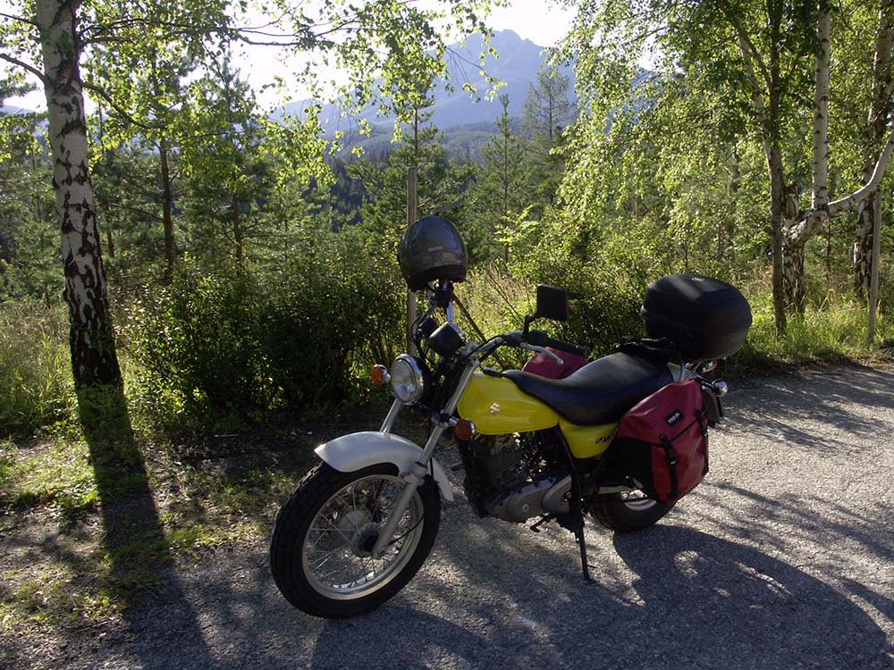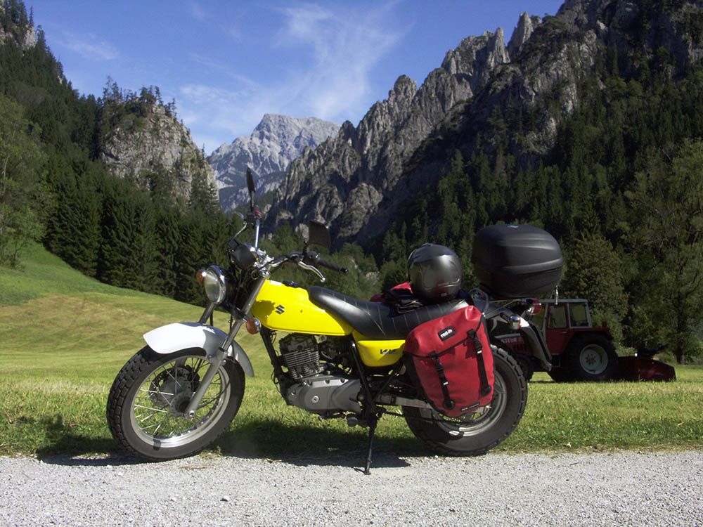 Zum Abreisetermin, Ende August, macht sich ein riesiges Tiefdruckgebiet über uns breit. Der Wetterbericht prophezeit Dauerregen. So habe ich es am Vorabend mit dem Packen nicht eilig und auch am Morgen schlafe ich gründlich aus. Während des gemütlichen Frühstücks hört der Regen auf und unerwarteter Weise kommt die Sonne durch. Jetzt aber rasch fertig packen. Über der Neugier, wie die erstmals vollbepackten Taschen auf die neuen selbst gemachten Halter passen, lasse ich die Schlüssel in der Wohnung liegen. Ausgesperrt. Zum Glück, sind die Bekannten, welche meine Reserveschlüssel haben, zu Hause und ich brauche sie nur abholen. Um 14 Uhr sitze ich dann endlich auf der Suzie, die Sonne scheint, das Tiefdruckgebiet kennt den Wetterbericht scheinbar nicht und mich packt nun endlich das Reisefieber. Klammhöhe, Ramsau, Ochssattel, Mariazell, Salzatal. Meine Vorstellung einer Route nach Kärnten.