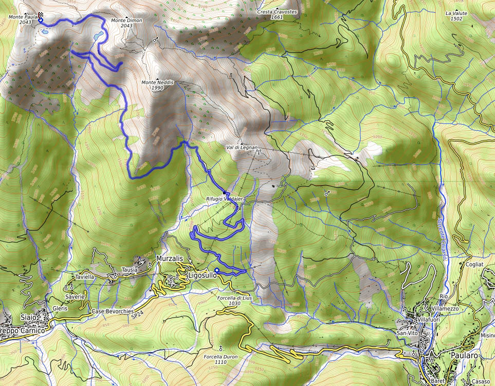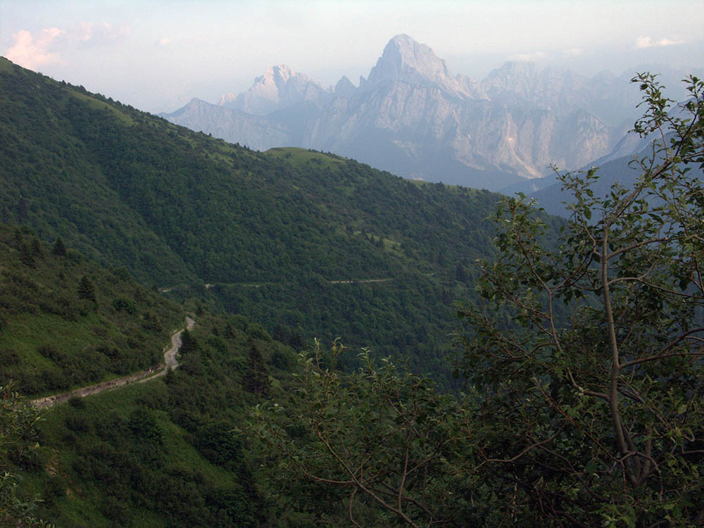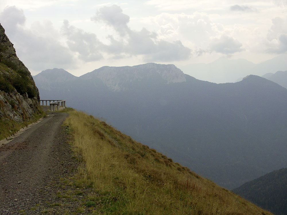 In Paularo geht es durch schmale Gassen, dann biegt man rechts ab und fährt einen Pass hoch. Eine wunderschöne Wolkenstimmung gibt es hier, doch meine Hoffnung liegt mehr bei der Sonne. Ich habe jetzt den Monte Paularo vor mir und weiß, dass ich hier irgendwo rechts abbiegen muss. Einen Hinweis auf ein Schloss Valdajer sollte ich finden, denn dort muss ich vorbei. Jetzt neigt sich die Straße abwärts. Zwischen Häusern windet sich die Straße in Kehren steil bergab. Das kann nicht richtig sein. Ich kehre um und fahre wieder den Berg hoch, dabei nach Wegen und Schildern Ausschau haltend. Ah, da vorne, braunes Schild: Castello di Valdajer. Tatsächlich gibt es nur ein Schild, natürlich nur von der Gegenrichtung zu lesen. Und der Weg, der hier abgeht? Wie alt muss ich noch werden, bis ich begreifen lerne, wenn ich auf einer uralten Militär-Schotterstraße auf die Alm fahren möchte, wird die Einfahrt dazu nicht wie die Autostrada aussehen.