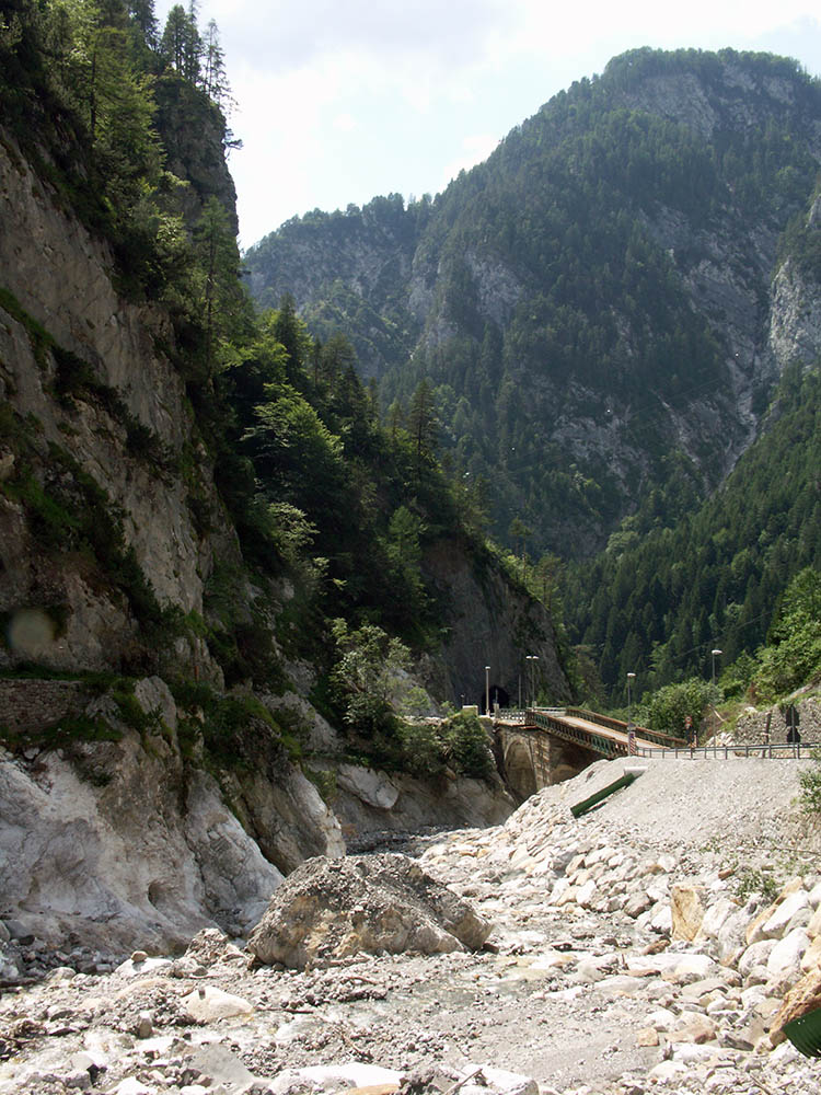 Über das Naßfeld geht es hinüber ins gelobte Land. Hier stellen sie einen Betonklotz neben den anderen. Die Parkplätze sind voll mit Autos. Alles Handwerker, welcher dieser Grauslichkeit für den Winter den letzten Schliff verpassen. Auf der Passhöhe wird es schlagartig anders. Ein kleiner ruhiger Bergsee, daneben eine einfache Trattoria. Die Straße wird schmal. Passo Promollo, wie das mit der richtigen italienischen Betonung in den Ohren klingt. - Leider habe ich später erfahren, dass diese Idylle nicht aus erhaltungswürdigen Gründen noch besteht, sondern ganz pragmatische finanzielle Gründe hat. Die Italiener haben auf der anderen Seite des Fella-Tales ihr Skigebiet Sella Nevea. Trotz intensivem Drängen der Österreicher länderübergreifend eine Skischaukel zu installieren, bauen die Italiener ihr bestehendes Gebiet aus. Sie schaffen sich keine Konkurrenz im eigenen Tal, wo sie hohe Investitionen haben und mit den Österreichern konkurrieren. Immer Geld. Die Werte dieser Natur kann man in keiner Währung messen. So bin ich froh, dass ich dies genießen kann.