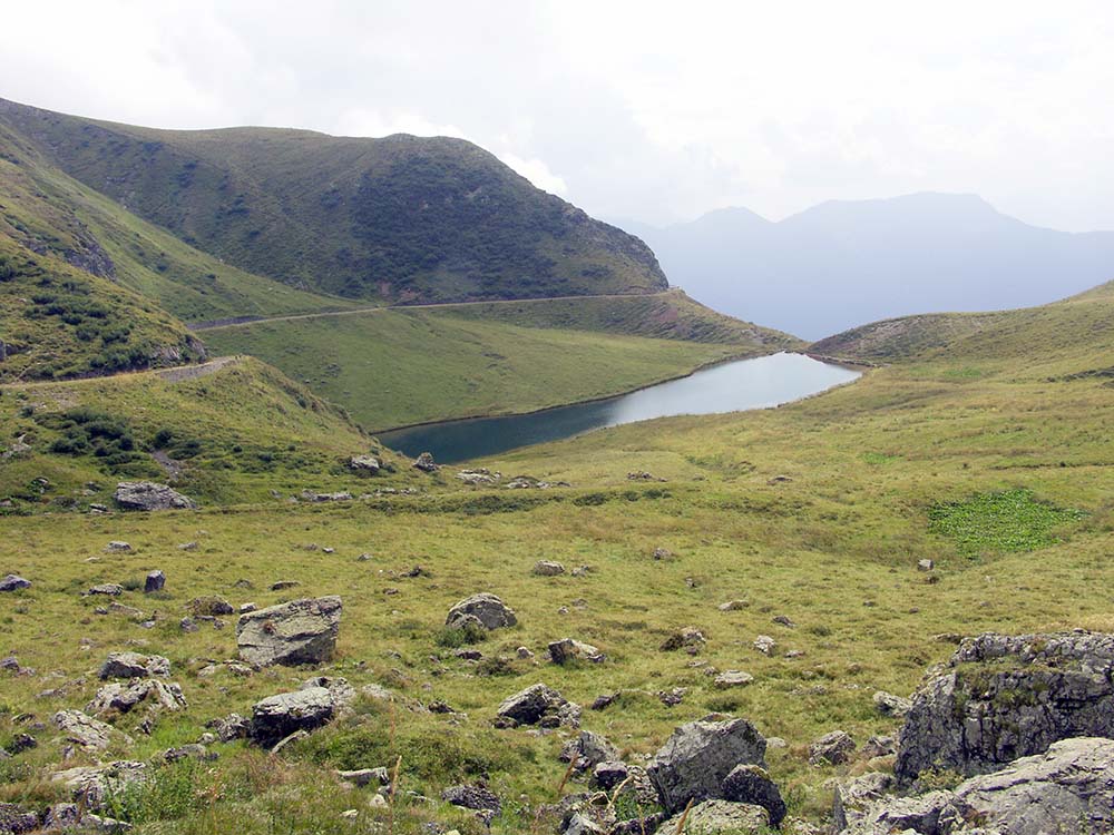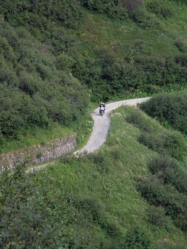 Die Straße ist sehr schmal, nur ungefähr ein Auto breit. Es sind nicht viele Kehren, aber sehr viele Kurven. Noch ist der Asphalt wie neu. Die Landschaft ist lieblich, der Pass ist nur rund 1500 m hoch. Und schon bin ich oben, keine Schwierigkeit, weit und breit. Der Belag ist brandneu. Also keine Bewährungsprobe.