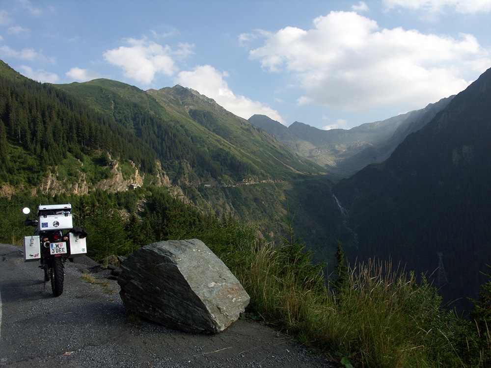 Über Ungarn gelangte ich vorerst nach Rumänien. Die Transfagarasan, eine Prachtstraße, welche die Karparten an ihren höchsten Erhebungen überquert ist ein absolutes Muss für jeden Motorradfahrer. Damals war die Straße noch nicht in dem hervorragenden Zustand indem sie heute ist, doch die großartige Anlage dieser Straße brauchte auch damals keinen Vergleich mit unserer "Großglockner-Hochalpenstraße" zu scheuen. Dies haben schon viele "Touris" entdeckt und daher tummeln sich hier die abenteuerlichsten Fahrzeuge, wie Maseratis, Porsches und Thai-Taxis.