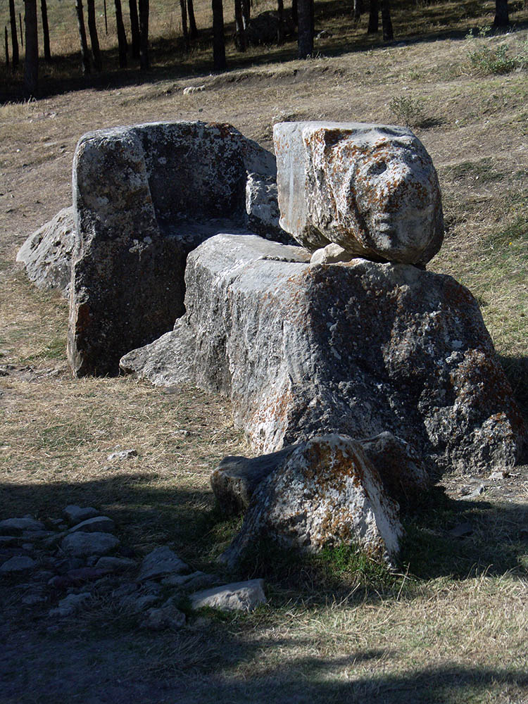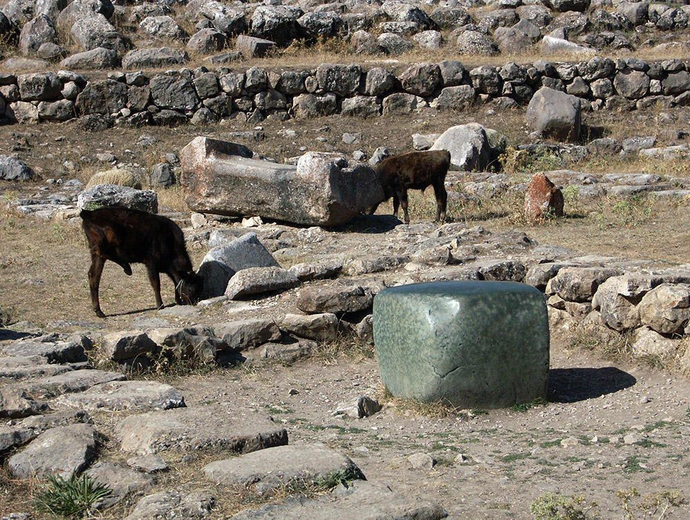 Man kennt bisher 27 hethitische Herrscher. Dem Herrscher stand ein Senat zur Seite, welcher gemeinsam mit dem Herrscher regierte und sogar über den König richten konnte. Auch so etwas ähnliches, wie eine Verfassung gab es. Fast so, wie heute. Es hat damals nicht funktioniert und wie wir sehen, haben wir in 3500 Jahren nichts dazu gelernt. Es funktioniert noch immer nicht. Böse Zungen behaupten, heute funktioniert es, aber nicht für uns. Doch zurück in die Antike. Einen wesentlichen Unterschied zu heute gibt es aber. In der Schlacht musste der König an der Spitze seiner Männer voran gehen. Wenn wir dieses Szenario wieder einführen, wäre die Welt deutlich friedlicher. Wer aber auch aller in die Schlachten eingegriffen hat. Bei den Schlachten eilten die Götter den Männern voraus und verursachten kriegsentscheidende Stürme, Donnerkeile und sonstige Katastrophen. Somit wird klar, warum die Hethiter "tausend Götter" brauchten. Die Tempelanlagen sind riesig und vielfältig. In einem der Tempel steht dieser grüne Stein. Man weiß nicht, was es mit diesem Stein auf sich hat, aber man weiß, dass es im bekannten Einflussgebiet der Hethiter kein Vorkommen von solchem Gestein gibt.