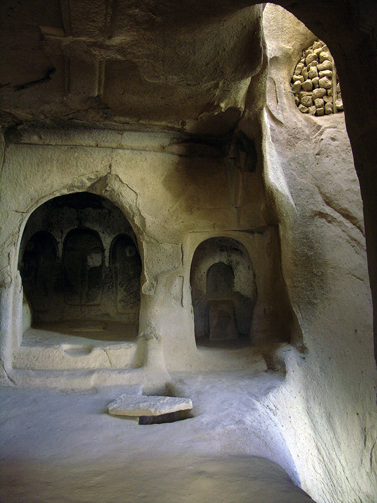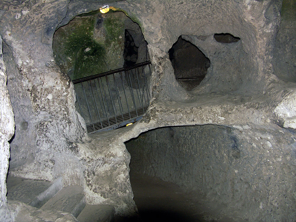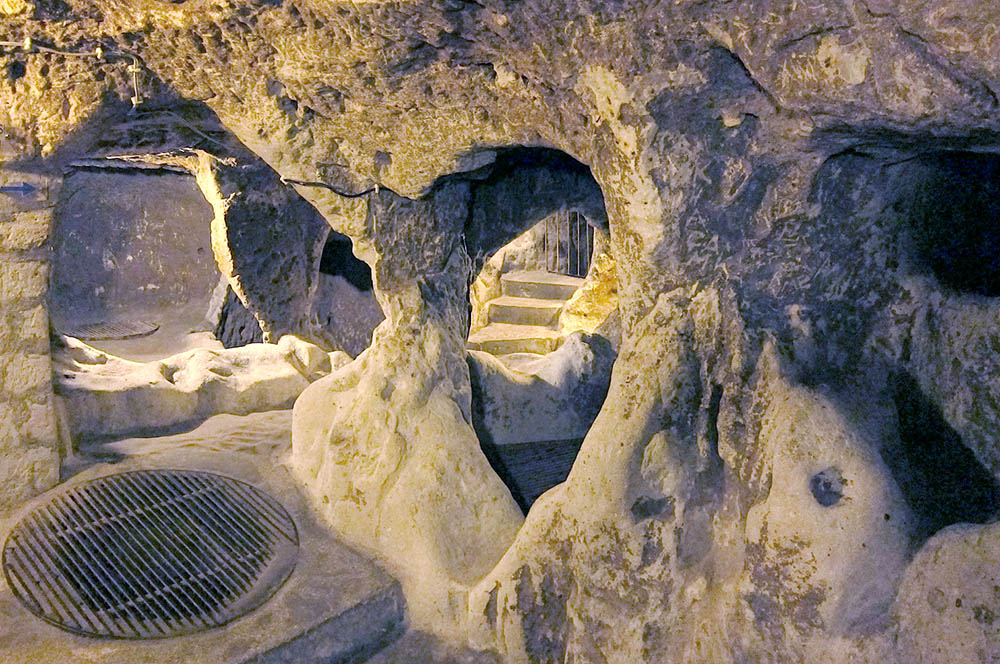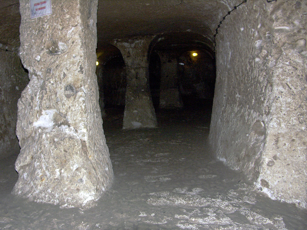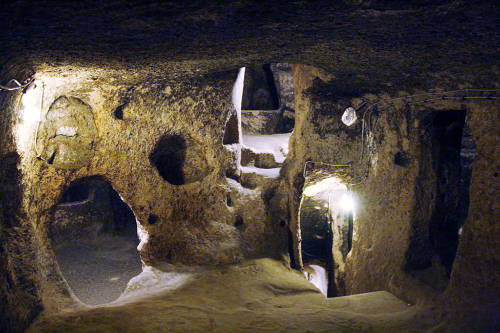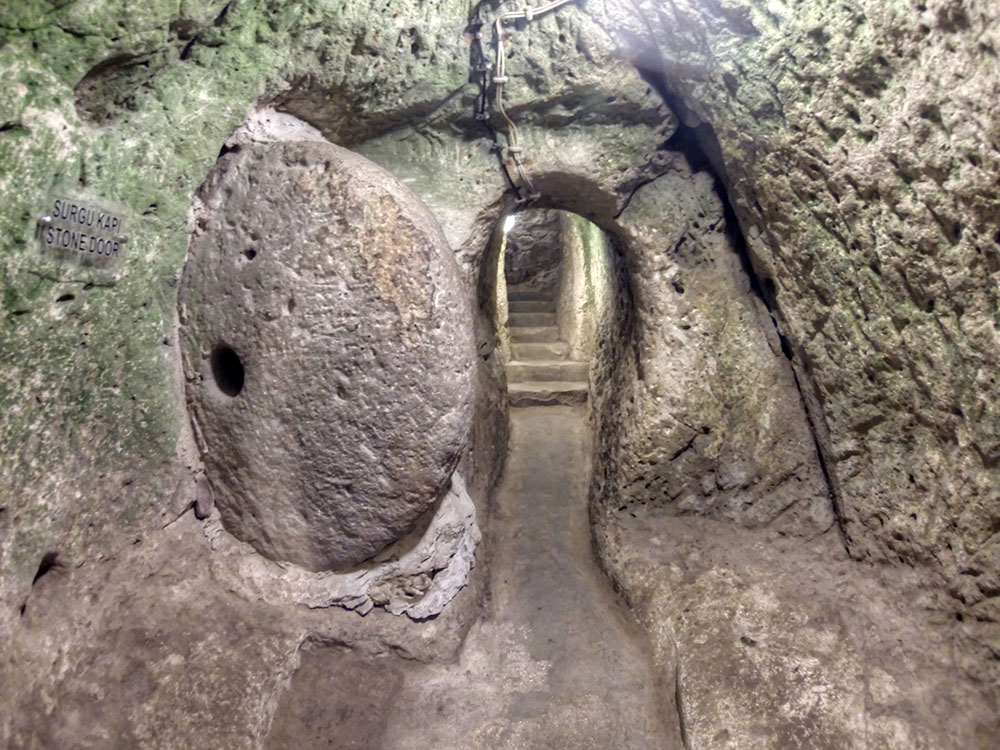 Es entstanden sogar mehrstöckige, unterirdische Städte. Die Bekannteste von ihnen, Derinkuyu habe ich besucht. Diese Stadt ist noch immer nicht ganz erschlossen. Bis jetzt hat man 8 Stockwerke bis in 55m Tiefe freigelegt. Schätzungsweise entspricht dies nur einem Viertel der ursprünglichen Anlage. Außer Wohnräumen gab es Versammlungs- und Lagerräume, mehrere Kirchen und sogar einen Kerker. Auch Stallungen für Haustiere sind vorhanden. Der größte Raum befindet sich in der sieben-tiefsten Etage und misst 25 x 10m bei 3m Höhe. Derinkuyu heißt "Tiefer Brunnen" und daher ist für Wasser auch gesorgt. Über ein ausgeklügeltes Belüftungssystem kann man spüren, wie die Luft zirkuliert. Durch mühlsteinartige Steine, welche von innen vor die Türen gerollt wurden, war man vor Angreifern sicher. Der Bau muss mindestens viele Jahrhunderte gedauert haben. Man vermutet, dass der Baubeginn sogar auf die Hethiter zurück geht.
