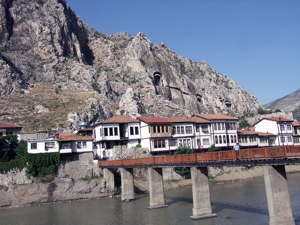 Auf dem Weg zum Nemrut Dagi komme ich durch Amasya. Dies ist eine Provinzhauptstadt, direkt an einem Fluss gelegen. Auf einem riesigen Felsen thront die Burg. Unter dieser Burg sind riesige Gräber in den Fels gehauen. Diese stammen aus hellenistischer Zeit (4.-2.Jh. v.Chr.) Die Portale der Gräber sind 12m hoch. Der Felsen mit Burg und den 5 Königsgräbern sind von überall in der Stadt sichtbar.