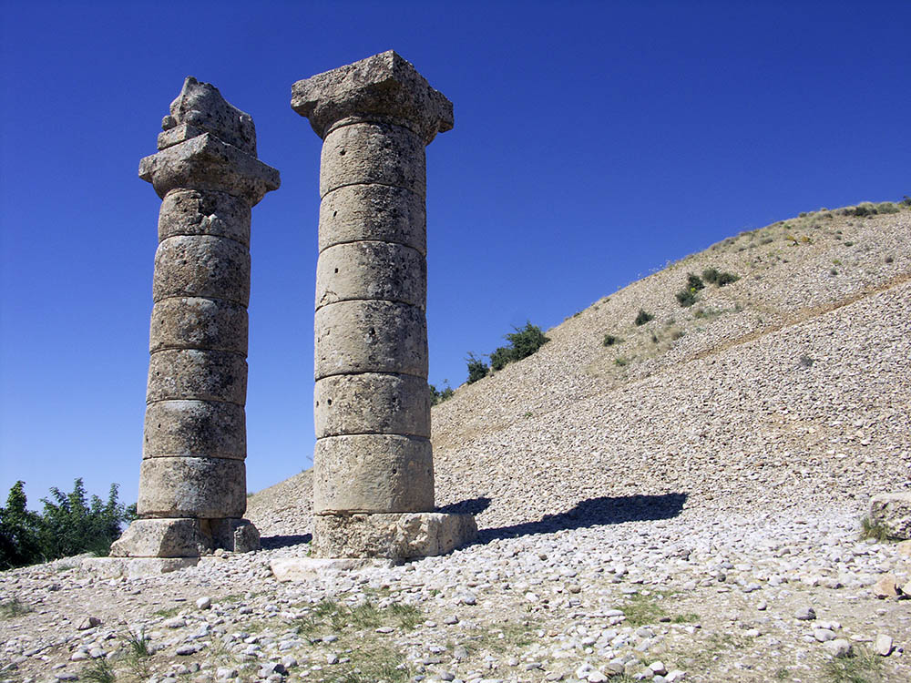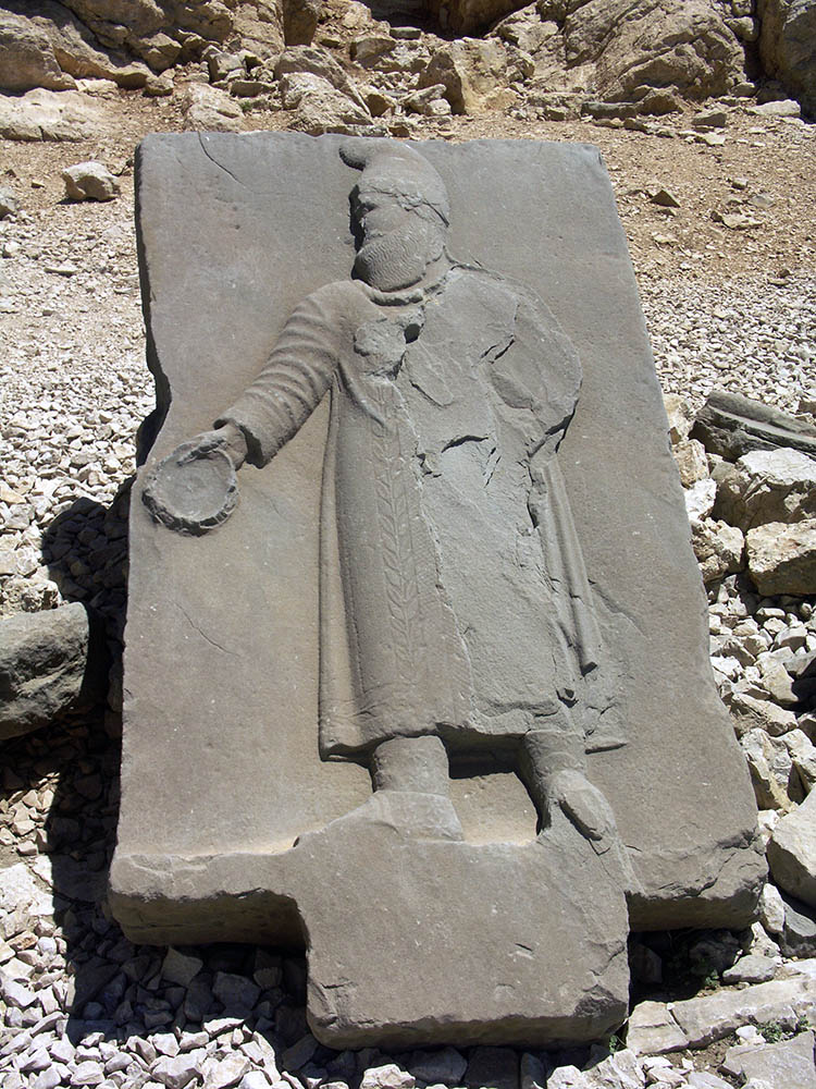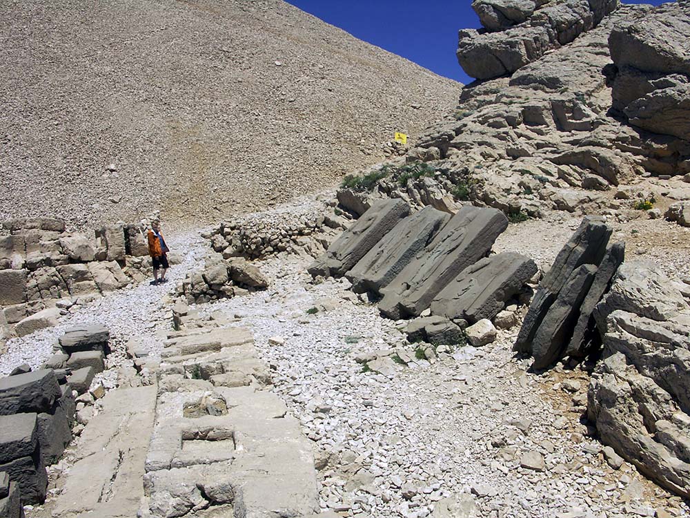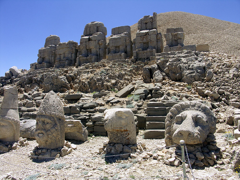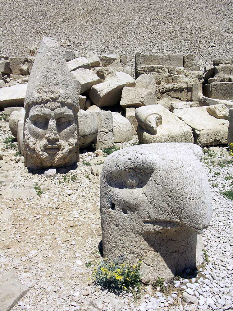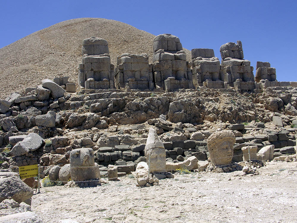 Nach so vielen Gräbern zieht es mich zum Grabmal schlechthin, dem Nemrut Dagi. Dies ist ein Berg am Oberlauf des Euphrat gelegen, der mit seinen 2150m zu den höchsten Erhebungen in der weiteren Umgebung zählt. Im letzten Jahrhundert v.Chr. lebte König Antiochos I. (wahrscheinlich der UrUrahn eines ehem. österr. Landes-Hauptmannes) und gründete eine neue Religion, welche Elemente der persischen und griechischen Mythologie vereinte. Nach seiner Krönung ernannte er sich selbst zum Gott und ließ auf dieser weithin sichtbaren Anhöhe ein monumentales Heiligtum und Begräbnisstätte errichten. Es wurde nie vollendet und ob er oder jemand anderer hier begraben ist, wurde bis heute nicht geklärt. Ein Öffnen des Tumulus (Grabhügels) ist nicht möglich, ohne den rund 50m hohen Geröllhaufen auf der Spitze des Berges vollkommen zu zerstören. Wenn man um den Grabhügel einmal herumgeht hat man einen Spaziergang von einem halben Kilometer absolviert. Dabei kommt man an 3 riesigen Terrassen vorbei auf denen monumentale Statuen aufgestellt sind. Diese rund 10m hohen Statuen sind vom Zahn der Zeit ziemlich angegriffen, außerdem hat sie ein Erdbeben kopflos gemacht. Die Köpfe wurden vor den Körpern platziert.