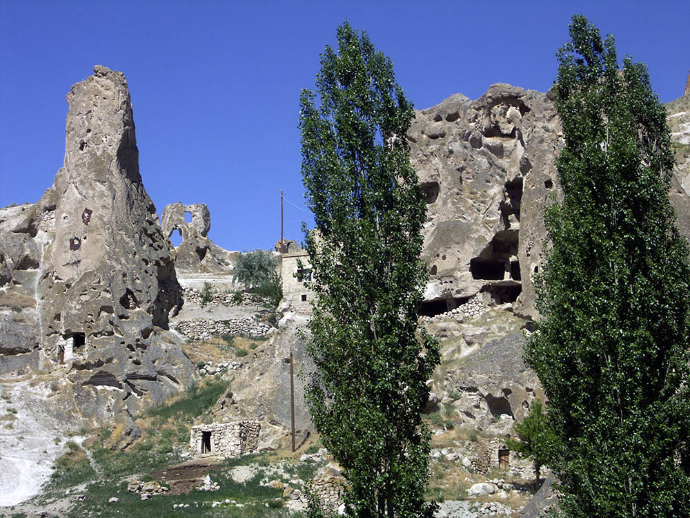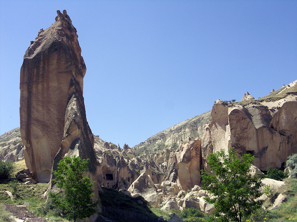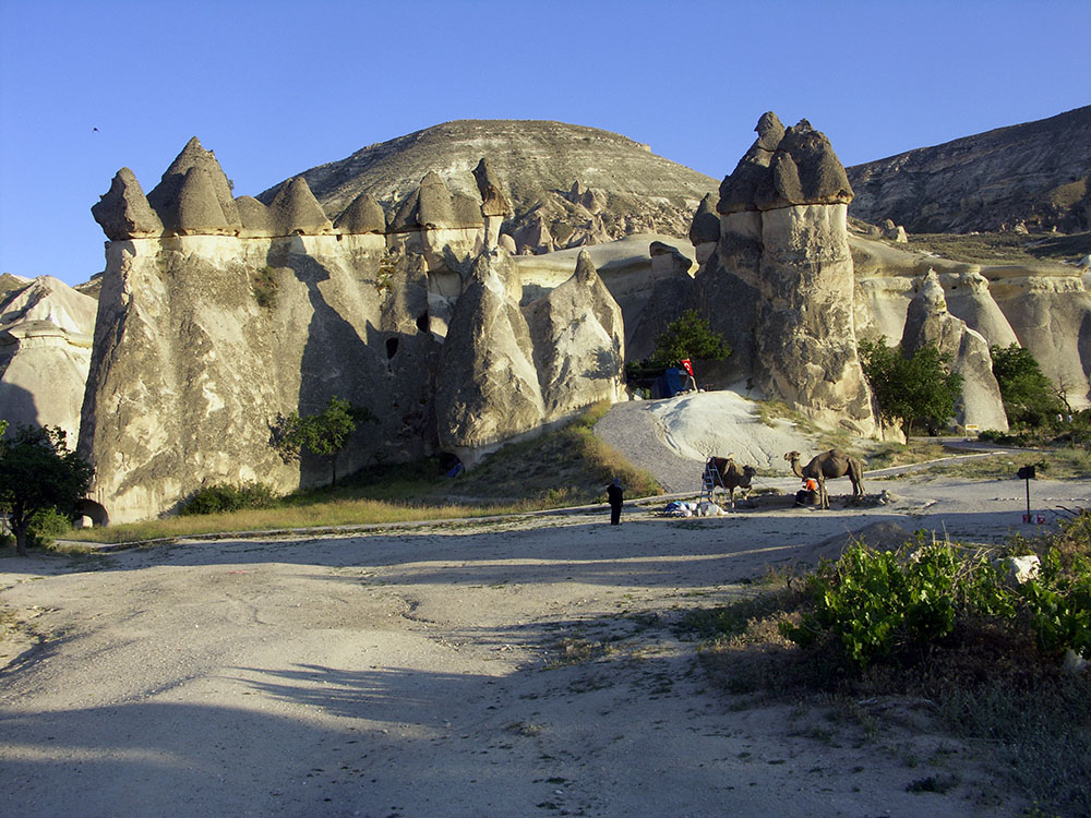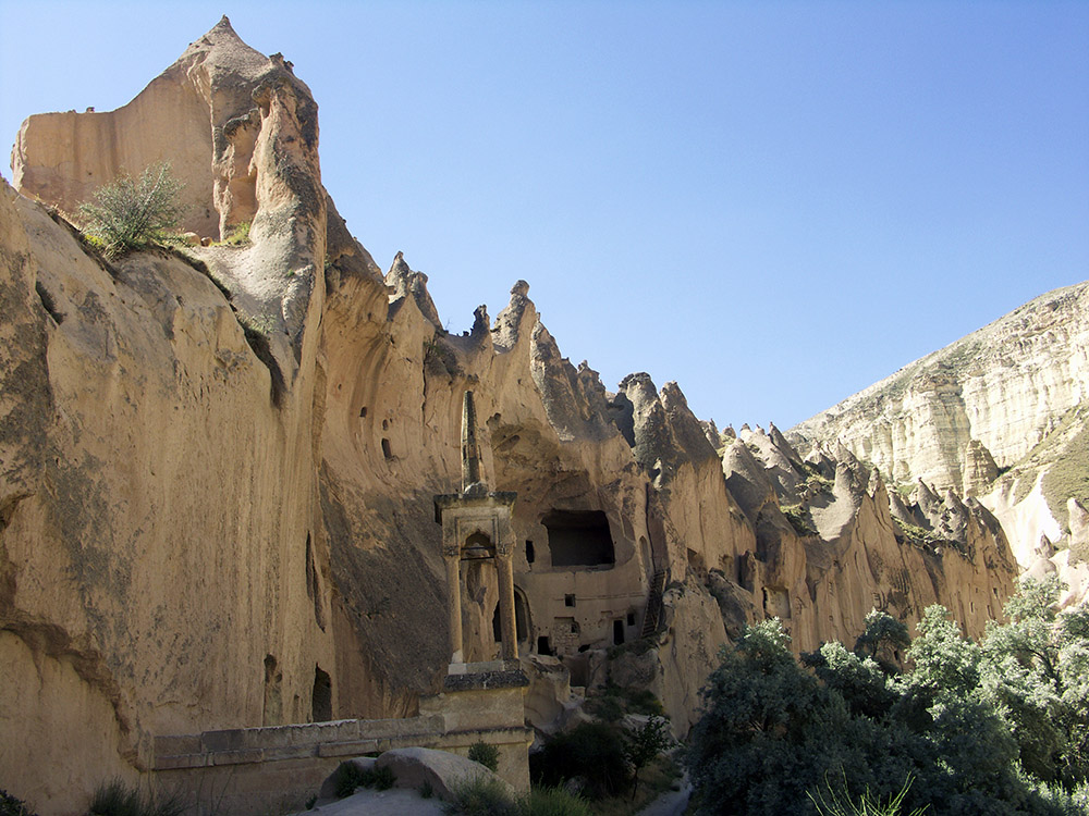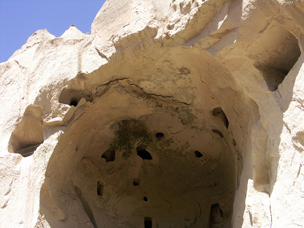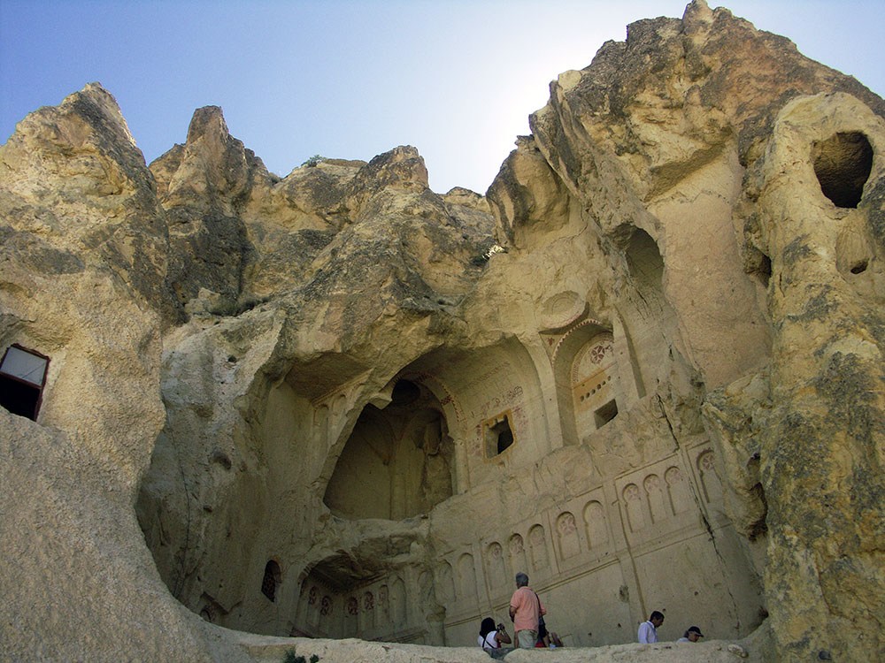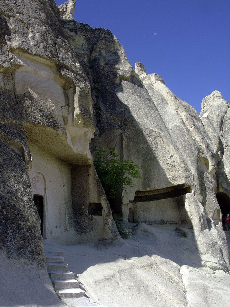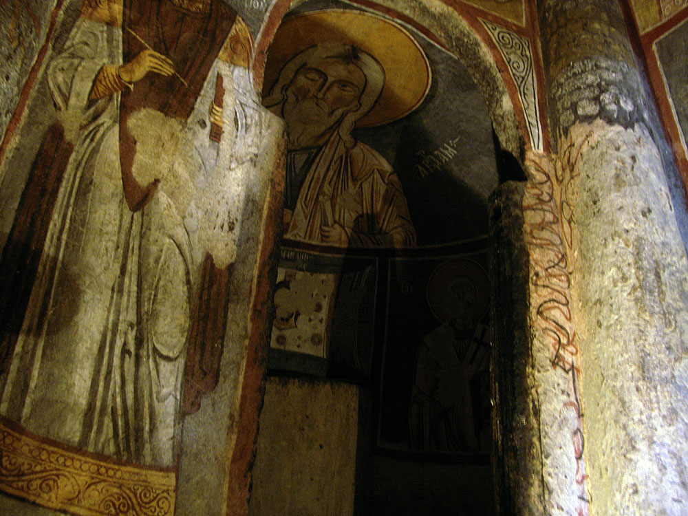 In Göreme gibt es im Freilichtmuseum einen Klosterkomplex zu besichtigen. Die ehemaligen Mönche dürften Jahrhunderte lang Pinsel schwingend verbracht haben, wenn sie nicht gerade wieder eine neue Kathedrale aus dem Gestein gekratzt haben. Sicherlich, ein gewaltiger Schatz, der hier zu besichtigen ist. Aber Preise und Verhalten sind absolut nicht klösterlich. Es herrscht absolutes Fotografierverbot, du musst alles kaufen, ob Bilder, Dias oder DVD´s, zu sehr stolzen Preisen. Selbstverständlich habe ich mich bei dem Eintrittspreis über das Verbot hinweg gesetzt und bin dadurch in Debatten verwickelt worden. Das Argument war, dass die Farben so empfindlich sind, das sie durch das Fotografieren Schaden nehmen. Da ich ohne Blitzlicht auch in der "Dunklen Kirche" fotografierte, konnte mich dieses Argument nicht überzeugen. Meine Foto-Ausbeute ist daher denkbar gering. Ein Erlebnis war es dennoch, trotz des Massenauflaufs.