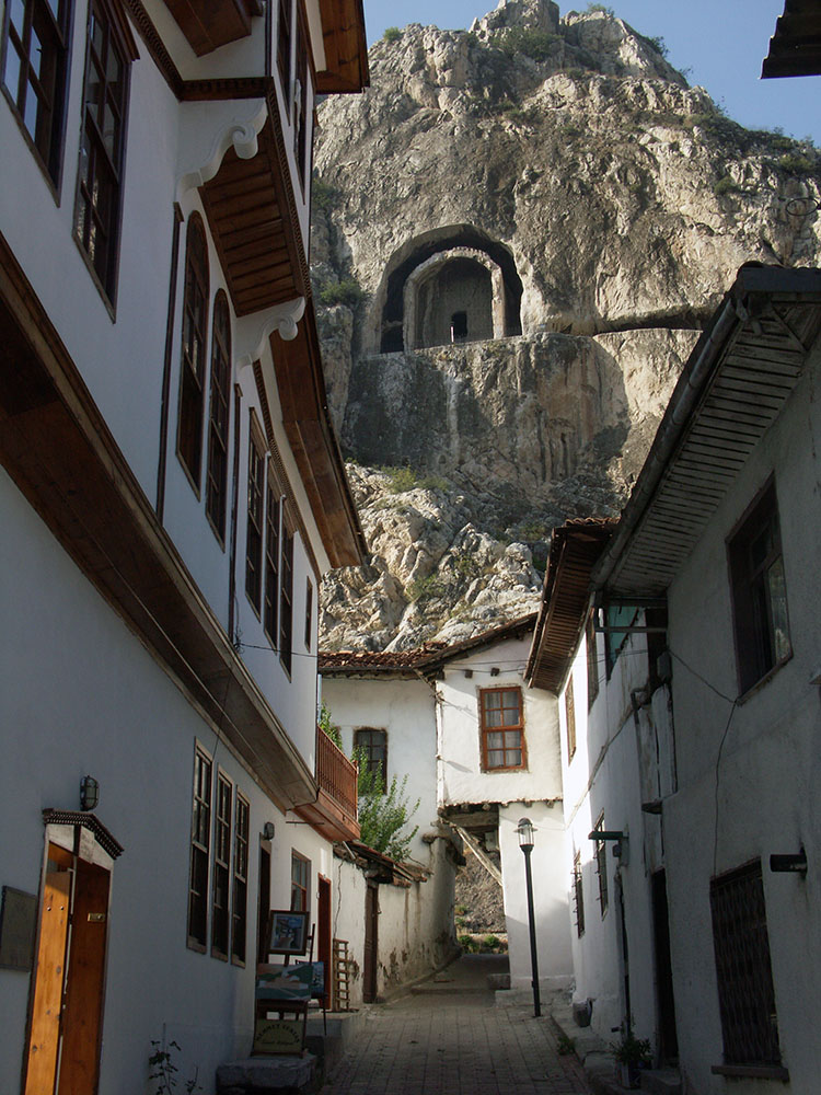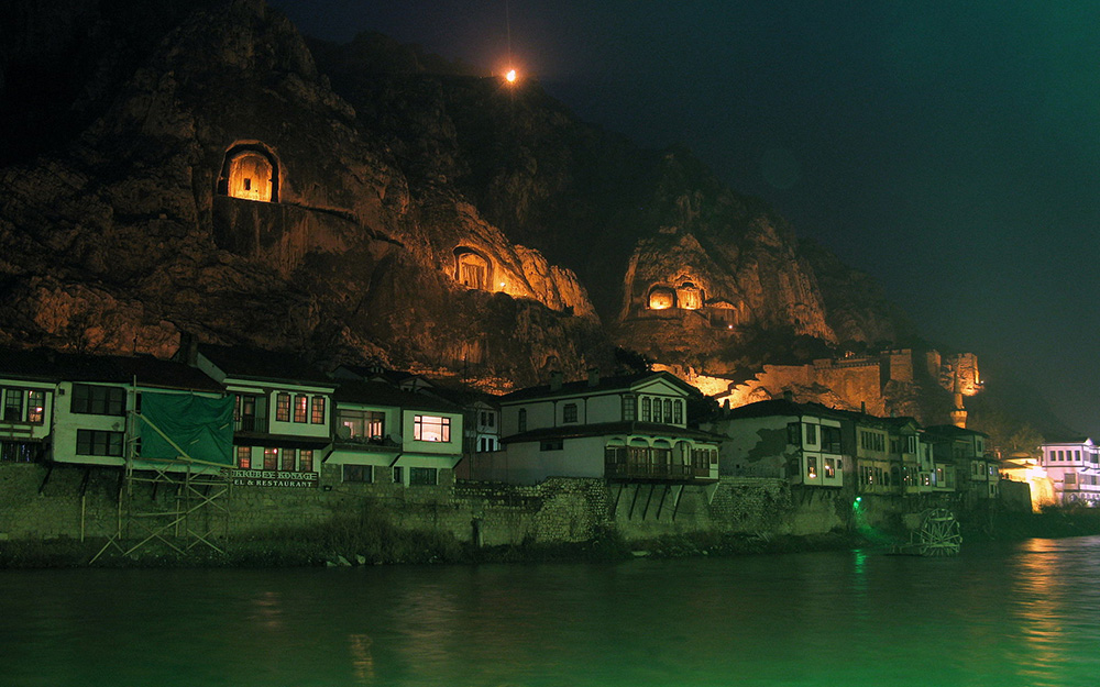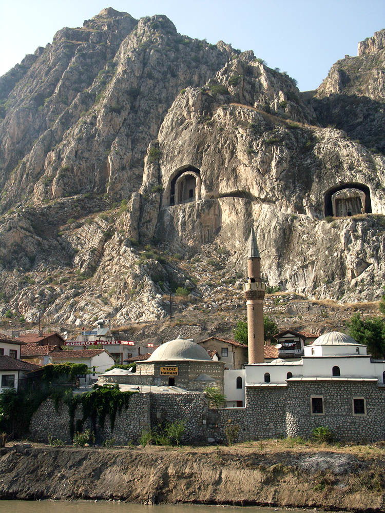Auf dem Weg zum Nemrut Dagi komme ich durch Amasya. Dies ist eine Provinzhauptstadt, direkt an einem Fluss gelegen. Auf einem riesigen Felsen thront die Burg. Unter dieser Burg sind riesige Gräber in den Fels gehauen. Diese stammen aus hellenistischer Zeit (4.-2.Jh. v.Chr.) Die Portale der Gräber sind 12m hoch. Der Felsen mit Burg und den 5 Königsgräbern sind von überall in der Stadt sichtbar.