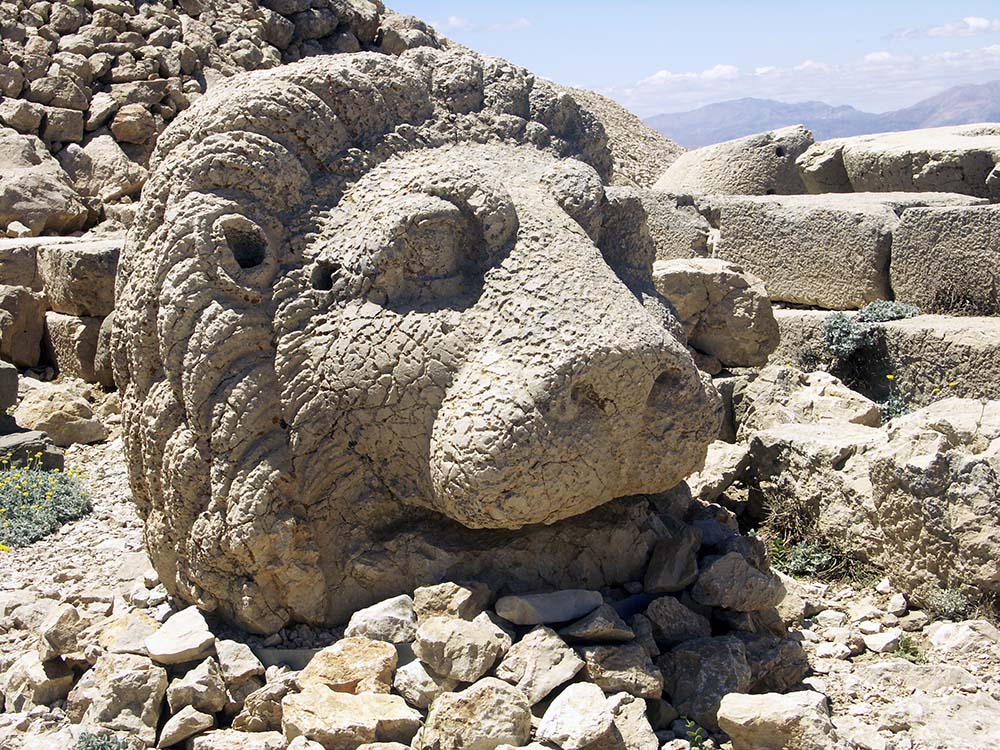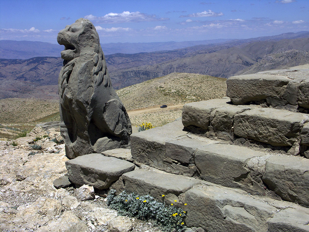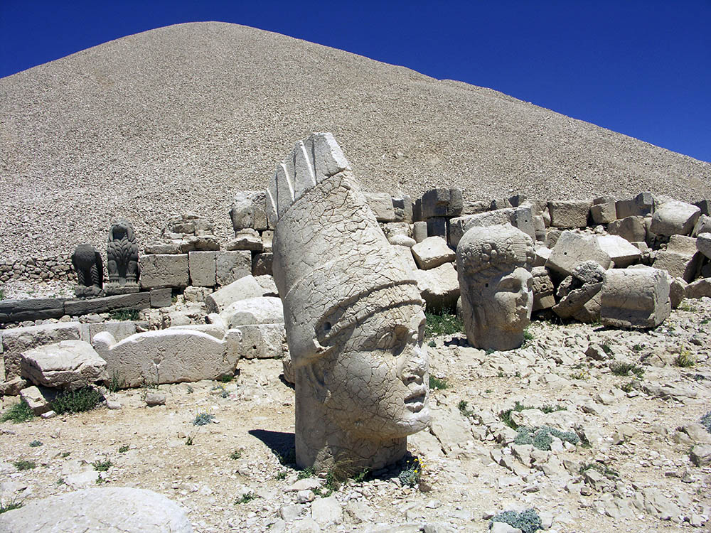 Nach so vielen Gräbern zieht es mich zum Grabmal schlechthin, dem Nemrut Dagi. Dies ist ein Berg am Oberlauf des Euphrat gelegen, der mit seinen 2150m zu den höchsten Erhebungen in der weiteren Umgebung zählt. Im letzten Jahrhundert v.Chr. lebte König Antiochos I. (wahrscheinlich der UrUrahn eines ehem. österr. Landes-Hauptmannes) und gründete eine neue Religion, welche Elemente der persischen und griechischen Mythologie vereinte. Nach seiner Krönung ernannte er sich selbst zum Gott und ließ auf dieser weithin sichtbaren Anhöhe ein monumentales Heiligtum und Begräbnisstätte errichten. Es wurde nie vollendet und ob er oder jemand anderer hier begraben ist, wurde bis heute nicht geklärt. Ein Öffnen des Tumulus (Grabhügels) ist nicht möglich, ohne den rund 50m hohen Geröllhaufen auf der Spitze des Berges vollkommen zu zerstören. Wenn man um den Grabhügel einmal herumgeht hat man einen Spaziergang von einem halben Kilometer absolviert. Dabei kommt man an 3 riesigen Terrassen vorbei auf denen monumentale Statuen aufgestellt sind. Diese rund 10m hohen Statuen sind vom Zahn der Zeit ziemlich angegriffen, außerdem hat sie ein Erdbeben kopflos gemacht. Die Köpfe wurden vor den Körpern platziert.